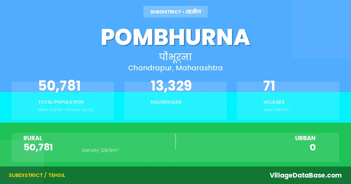 According to the 2011 census The total area of Pombhurna Tehsil is 398 km², with a population of 50781 people. The population density is 128 inhabitants per square kilometre, and there are approximately 13329 houses in the sub district.