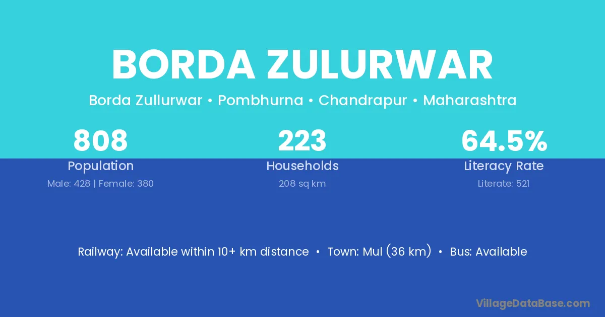 Mul (36 km) is the nearest town to Borda Zulurwar village for major economic activities and is located approximately 36 km away.