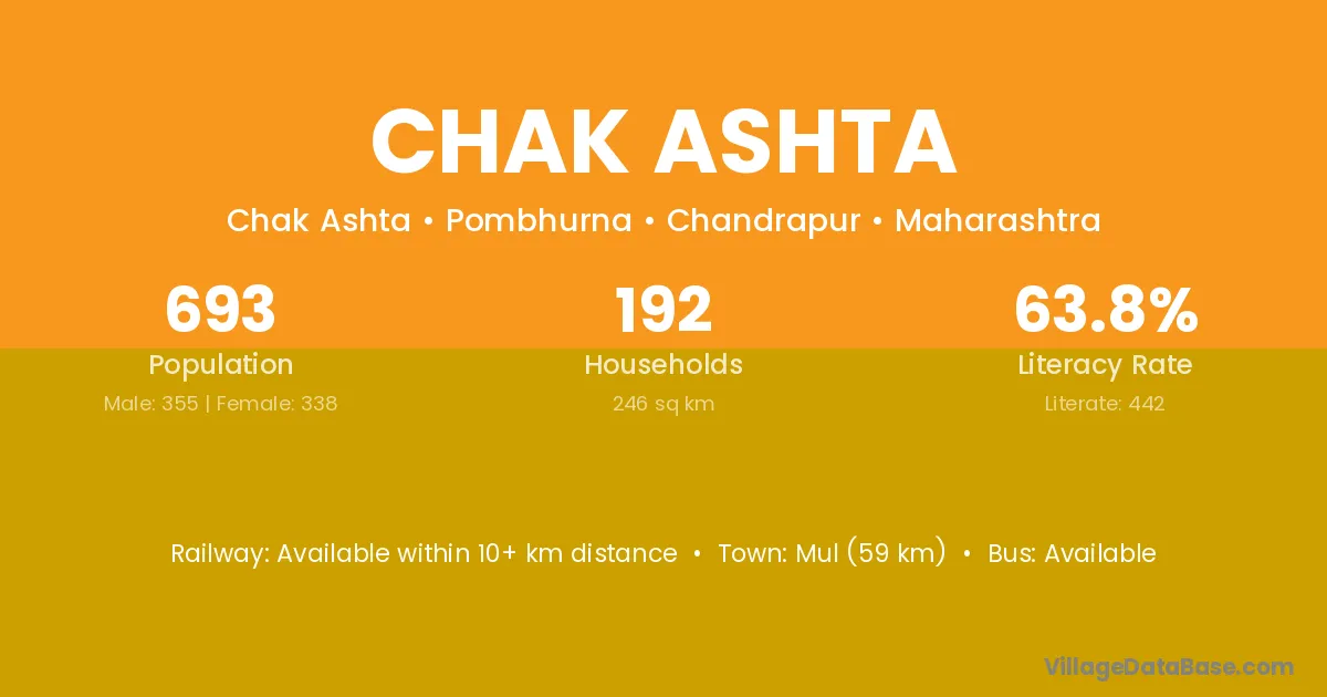 Mul (59 km) is the nearest town to Chak Ashta village for major economic activities and is located approximately 59 km away.