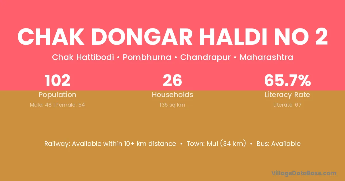 Mul (34 km) is the nearest town to Chak Dongar Haldi No 2 village for major economic activities and is located approximately 34 km away.