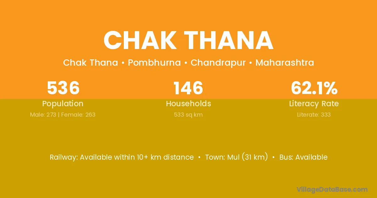 Mul (31 km) is the nearest town to Chak Thana village for major economic activities and is located approximately 31 km away.