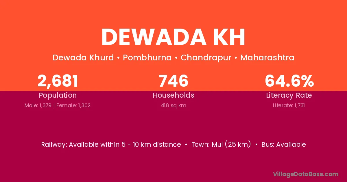 Mul (25 km) is the nearest town to Dewada Kh village for major economic activities and is located approximately 25 km away.