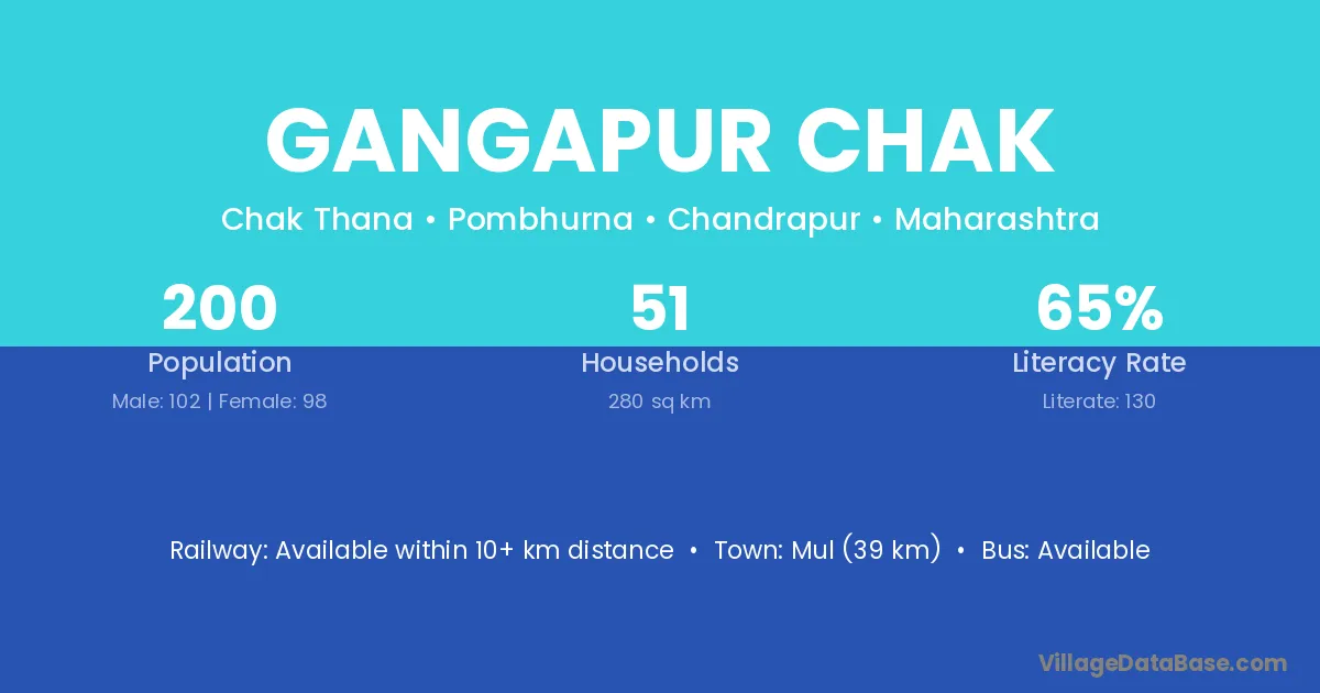Mul (39 km) is the nearest town to Gangapur Chak village for major economic activities and is located approximately 39 km away.