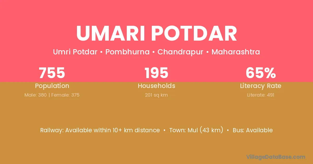Mul (43 km) is the nearest town to Umari Potdar village for major economic activities and is located approximately 43 km away.