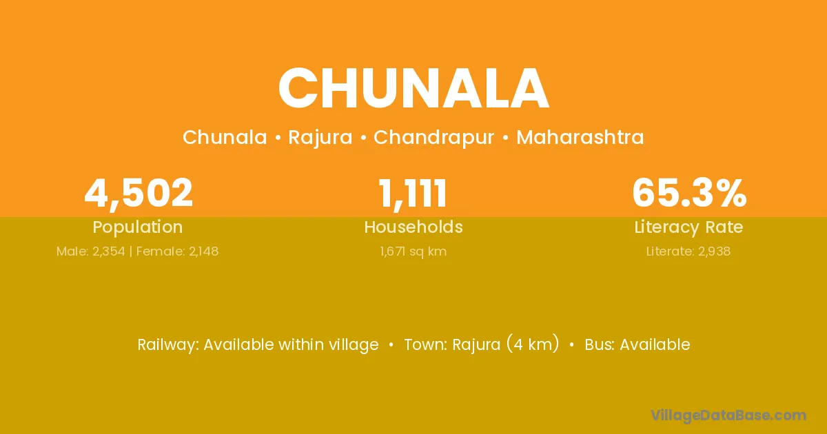Rajura (4 km) is the nearest town to Chunala village for major economic activities and is located approximately 4 km away.