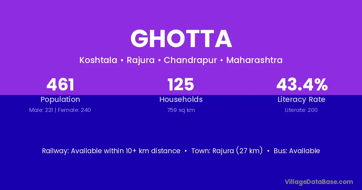 Rajura (27 km) is the nearest town to Ghotta village for major economic activities and is located approximately 27 km away.