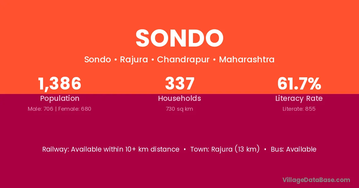 Rajura (13 km) is the nearest town to Sondo village for major economic activities and is located approximately 13 km away.