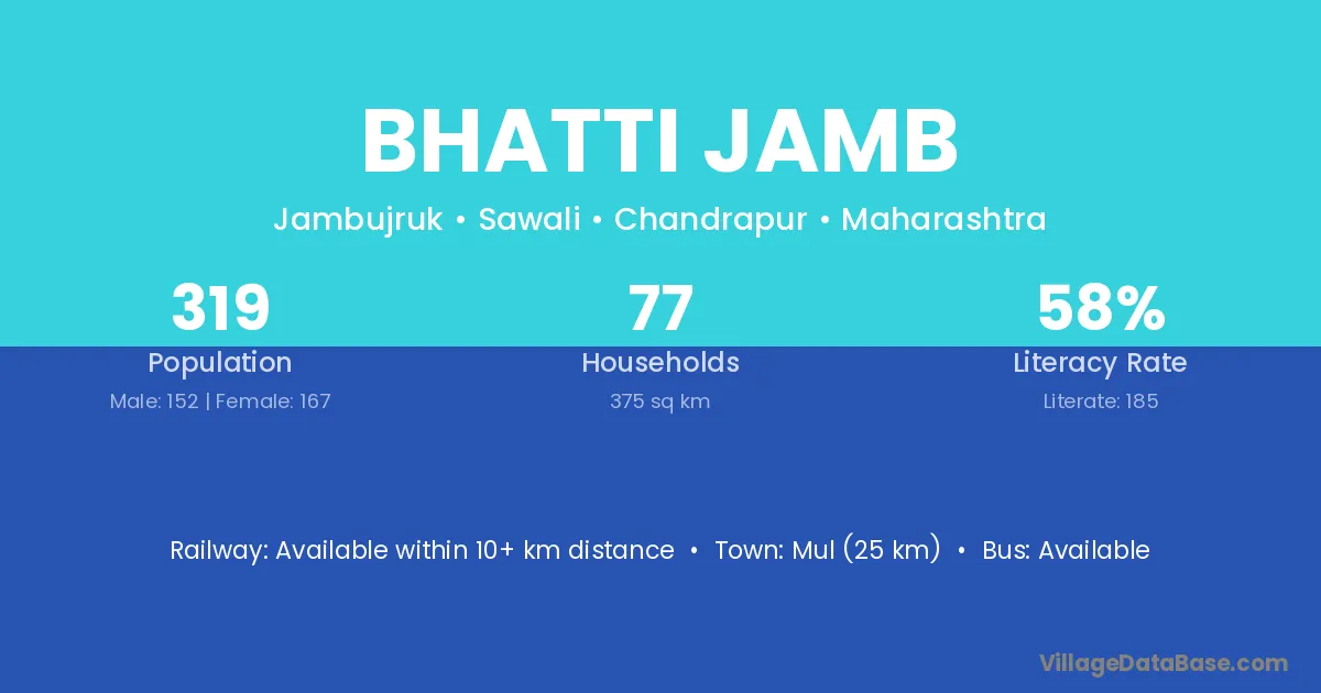 Mul (25 km) is the nearest town to Bhatti Jamb village for major economic activities and is located approximately 25 km away.
