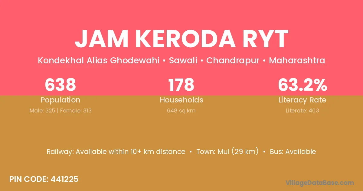 Mul (29 km) is the nearest town to Jam Keroda Ryt village for major economic activities and is located approximately 29 km away.