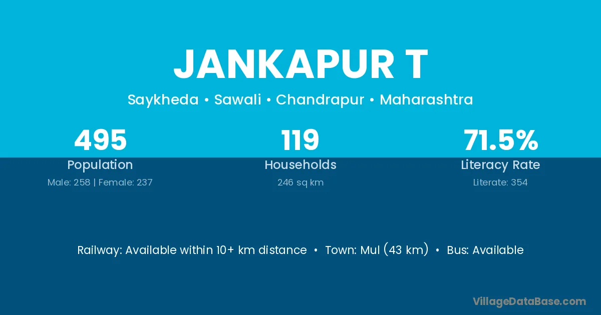 Mul (43 km) is the nearest town to Jankapur T village for major economic activities and is located approximately 43 km away.