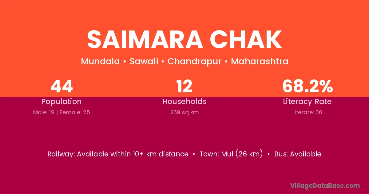 Mul (26 km) is the nearest town to Saimara Chak village for major economic activities and is located approximately 26 km away.