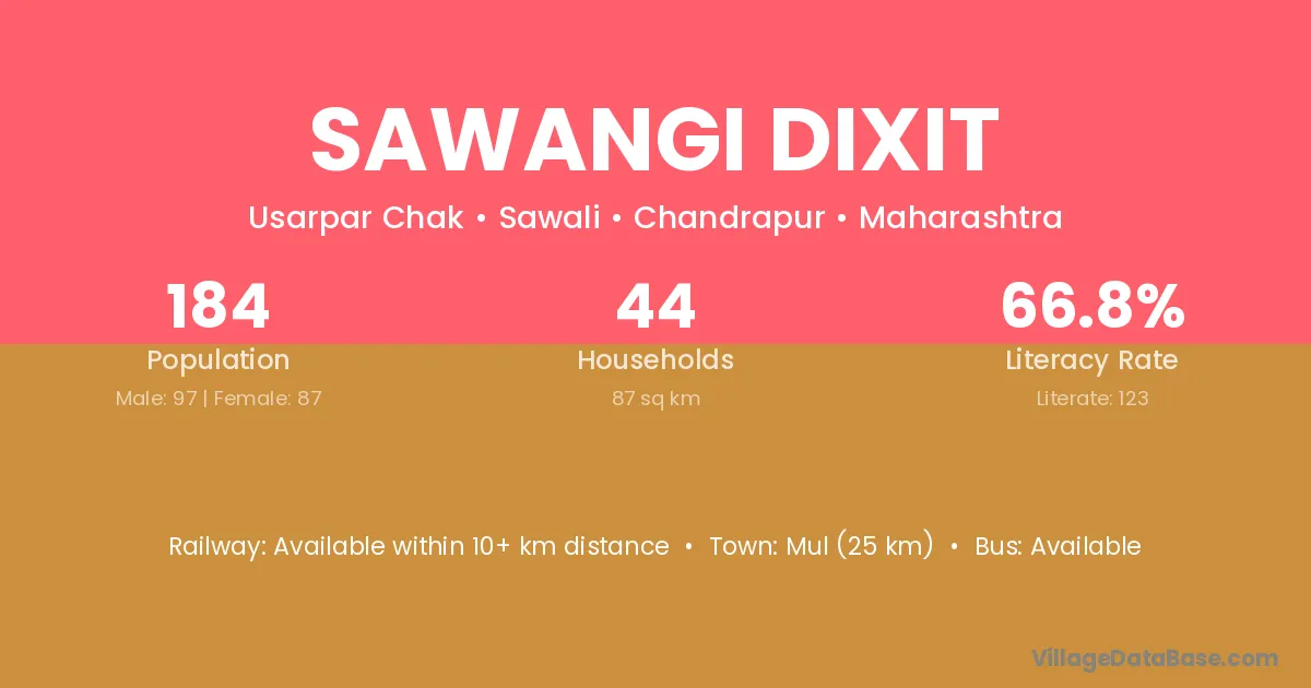 Sawangi Dixit village has a total population of 184 people, of which 97 are males and 87 are females.