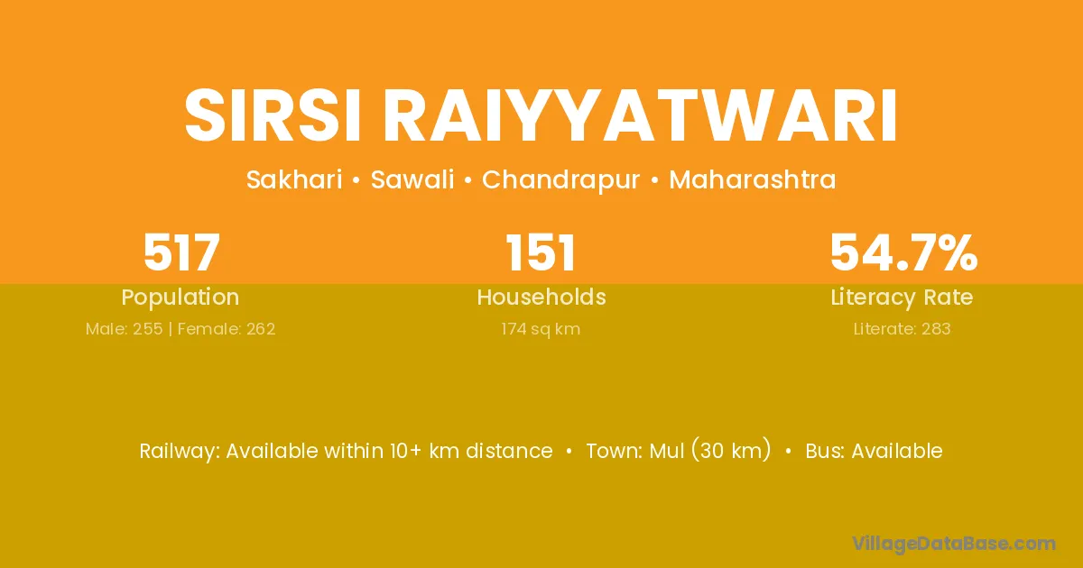Mul (30 km) is the nearest town to Sirsi Raiyyatwari village for major economic activities and is located approximately 30 km away.