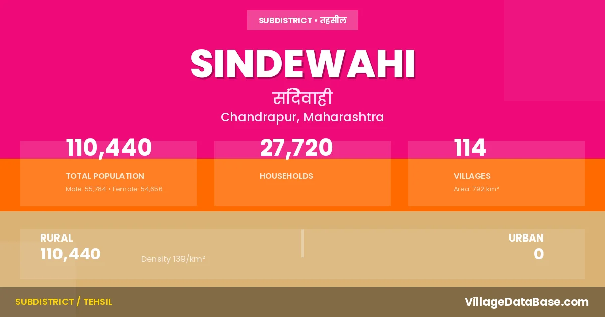 According to the 2011 census The total area of Sindewahi Tehsil is 792 km², with a population of 110440 people. The population density is 139 inhabitants per square kilometre, and there are approximately 27720 houses in the sub district.