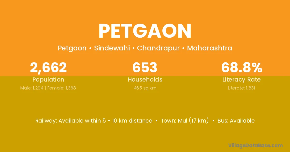 Mul (17 km) is the nearest town to Petgaon village for major economic activities and is located approximately 17 km away.