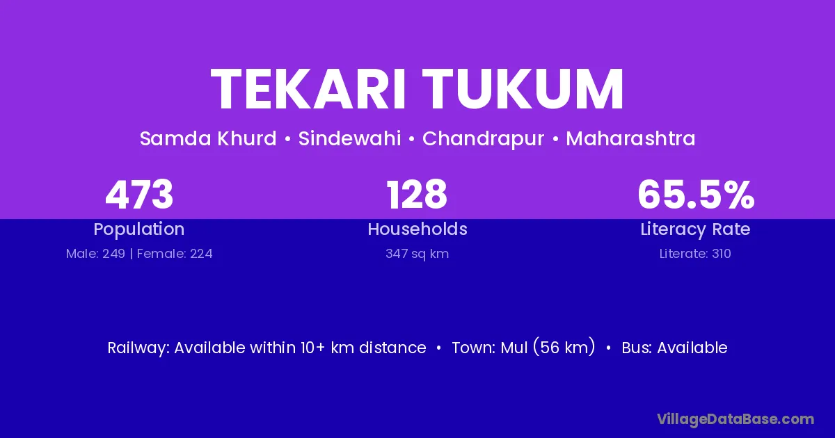 Mul (56 km) is the nearest town to Tekari Tukum village for major economic activities and is located approximately 56 km away.