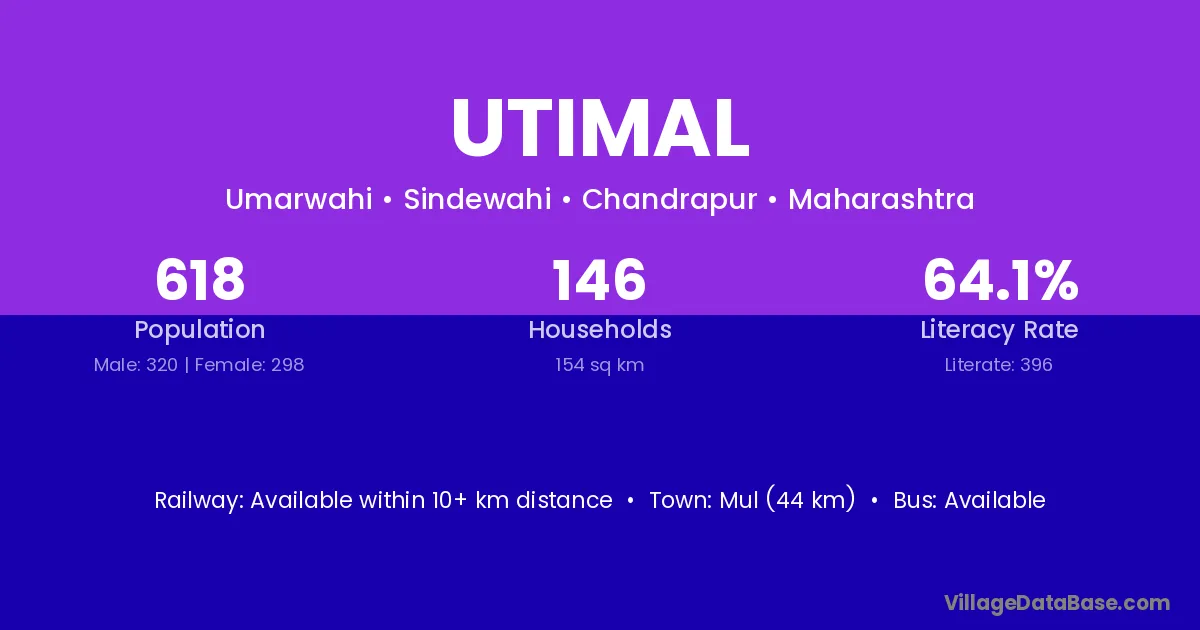 Mul (44 km) is the nearest town to Utimal village for major economic activities and is located approximately 44 km away.