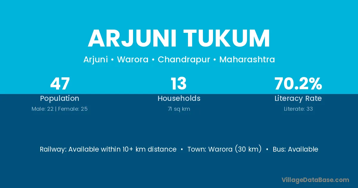 Warora (30 km) is the nearest town to Arjuni Tukum village for major economic activities and is located approximately 30 km away.