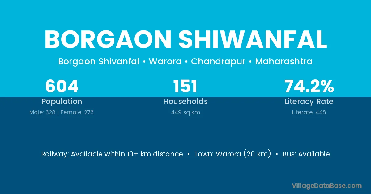 Warora (20 km) is the nearest town to Borgaon Shiwanfal village for major economic activities and is located approximately 20 km away.