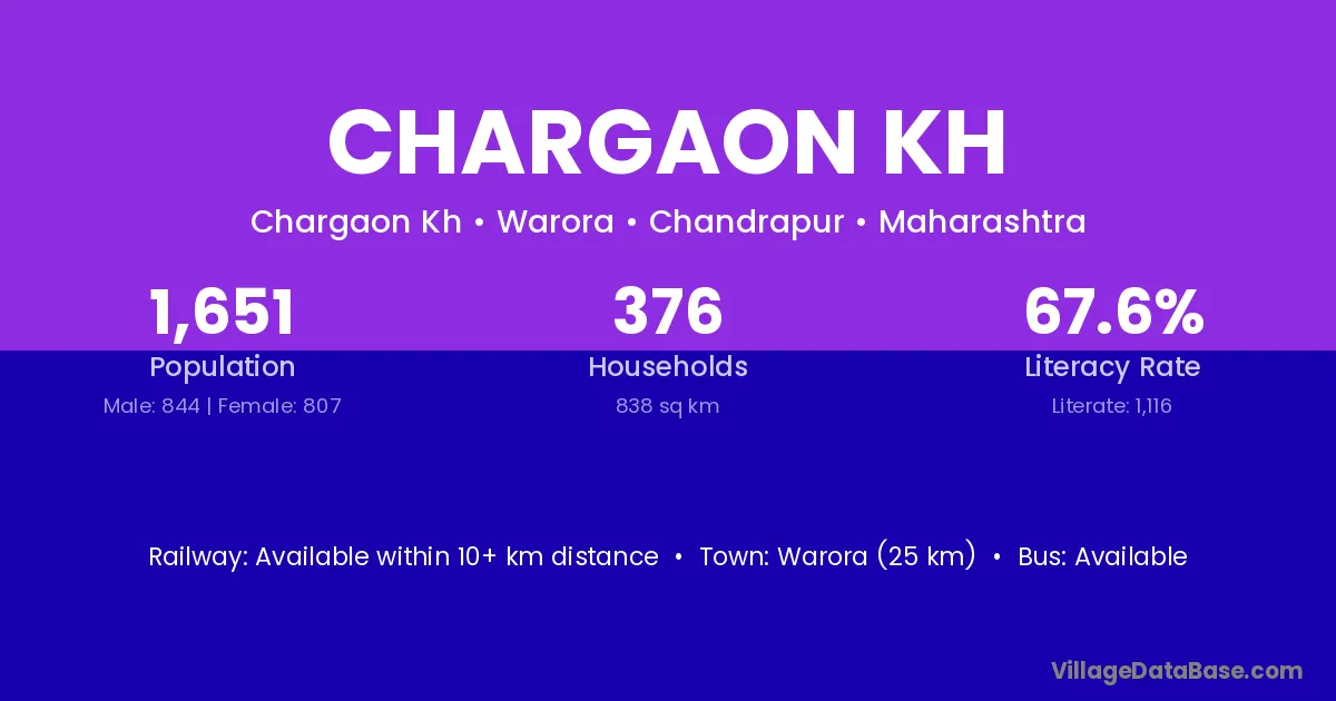 Warora (25 km) is the nearest town to Chargaon Kh village for major economic activities and is located approximately 25 km away.