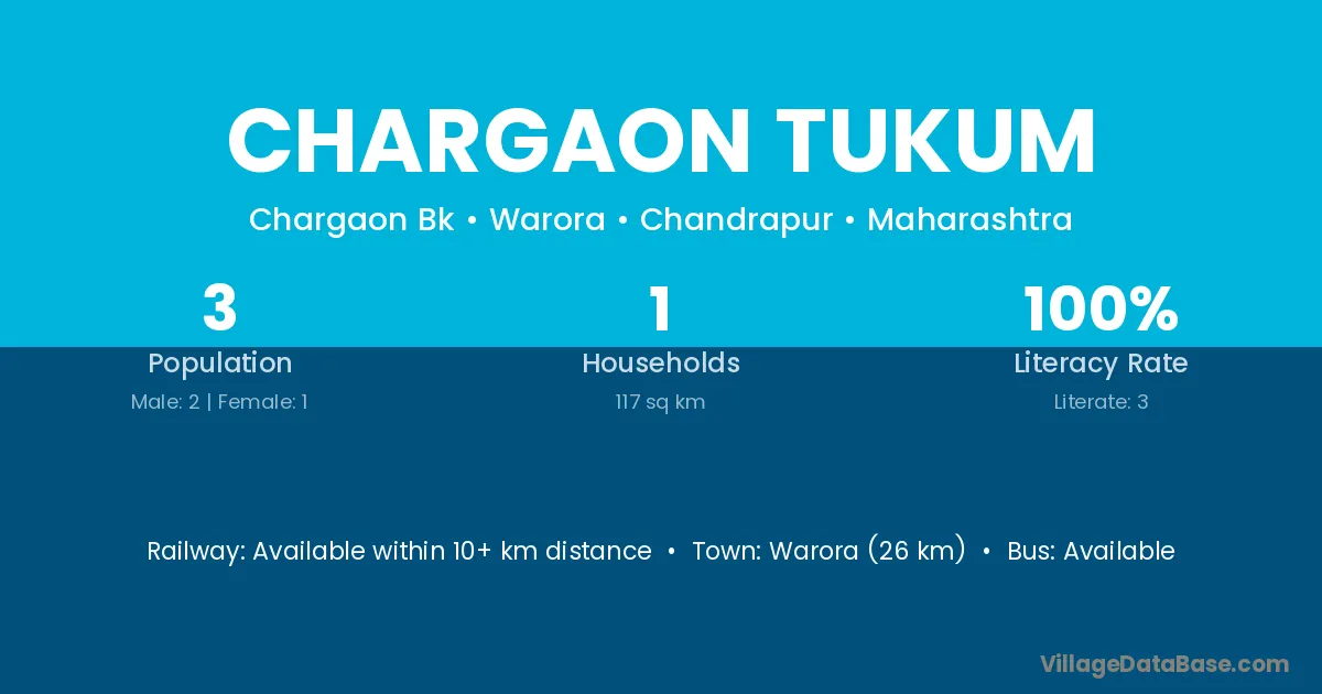 Warora (26 km) is the nearest town to Chargaon Tukum village for major economic activities and is located approximately 26 km away.