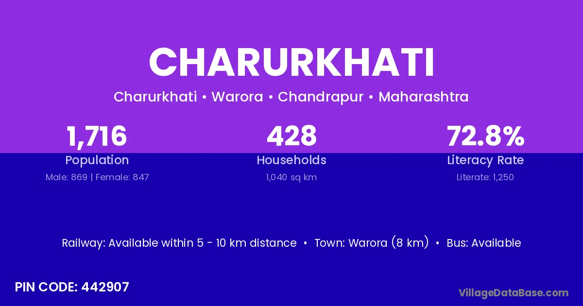 Warora (8 km) is the nearest town to Charurkhati village for major economic activities and is located approximately 8 km away.