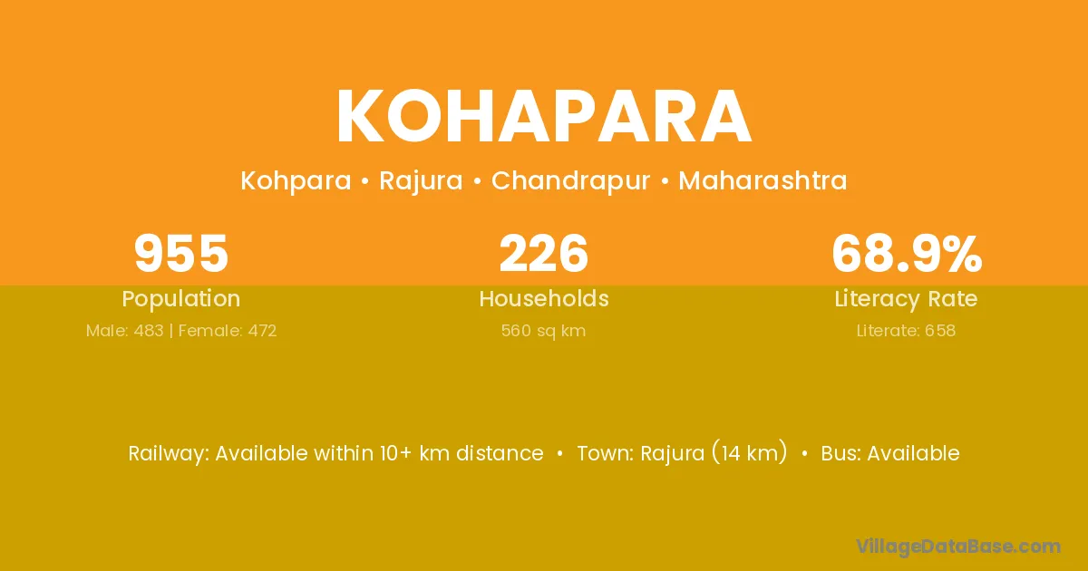 Warora (25 km) is the nearest town to Kohapara village for major economic activities and is located approximately 25 km away.