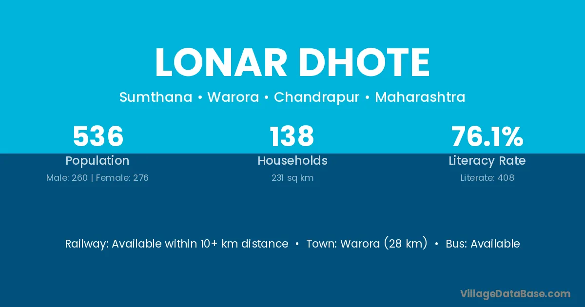 Warora (28 km) is the nearest town to Lonar Dhote village for major economic activities and is located approximately 28 km away.