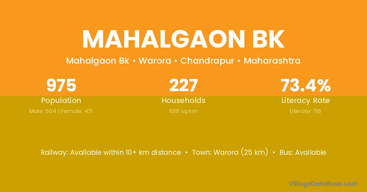 Warora (25 km) is the nearest town to Mahalgaon Bk village for major economic activities and is located approximately 25 km away.