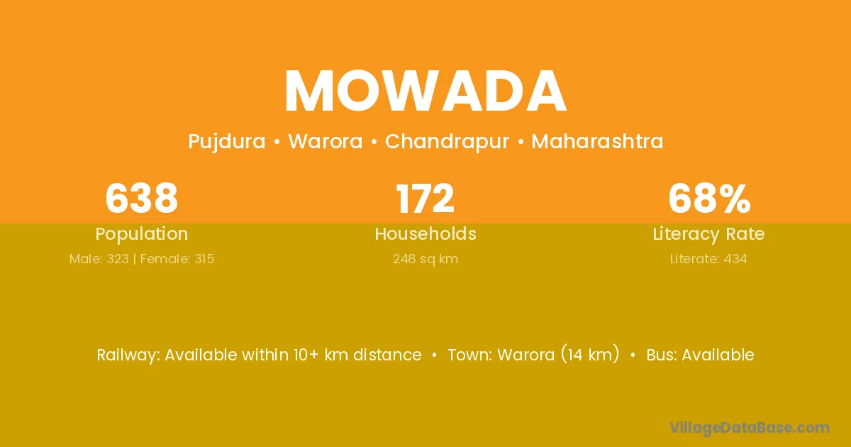 Warora (14 km) is the nearest town to Mowada village for major economic activities and is located approximately 14 km away.