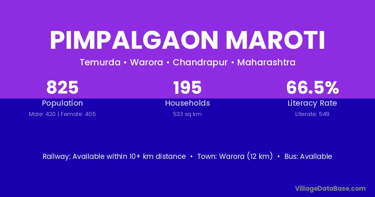 Pimpalgaon Maroti village has a total population of 825 people, of which 420 are males and 405 are females.