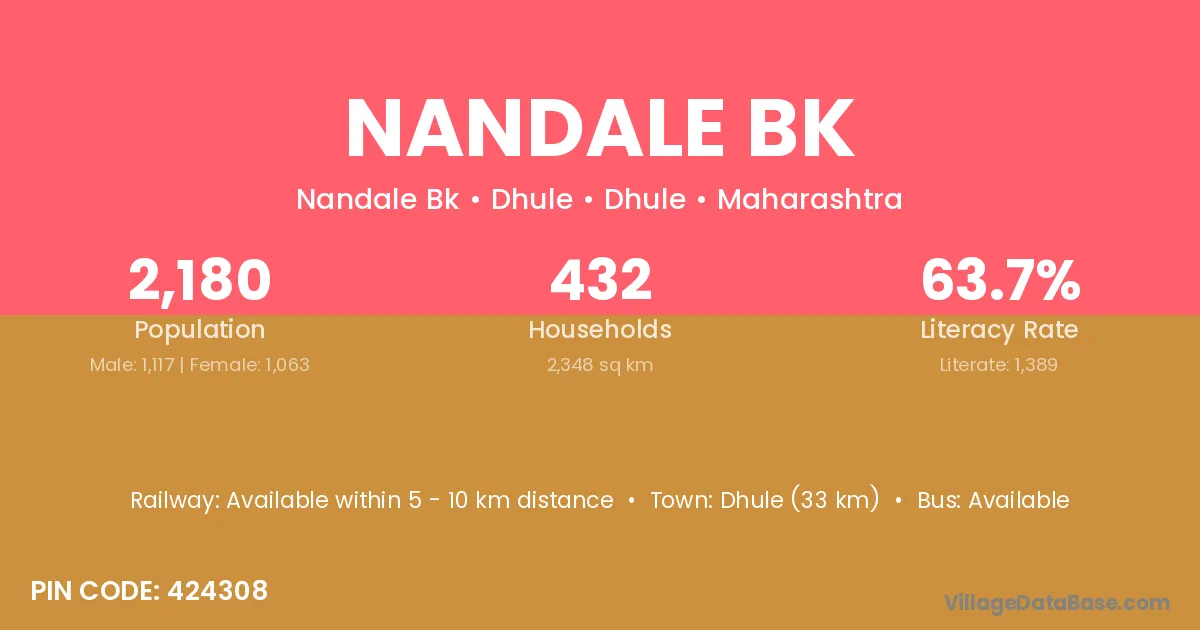 Dhule (33 km) is the nearest town to Nandale Bk village for major economic activities and is located approximately 33 km away.