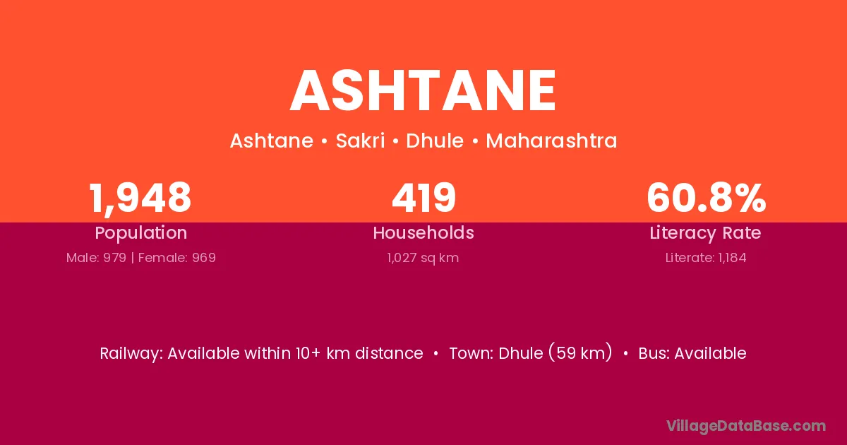 Dhule (59 km) is the nearest town to Ashtane village for major economic activities and is located approximately 59 km away.