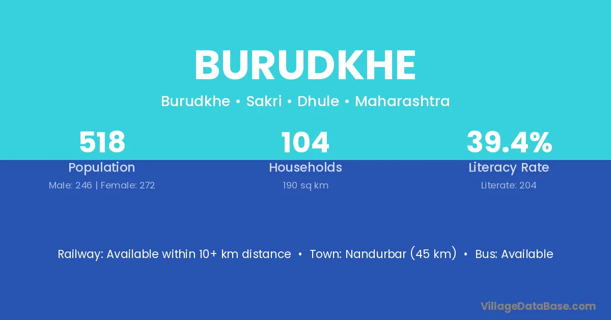 Nandurbar (45 km) is the nearest town to Burudkhe village for major economic activities and is located approximately 45 km away.