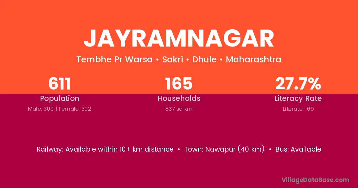 Jayramnagar village has a total population of 611 people, of which 309 are males and 302 are females.