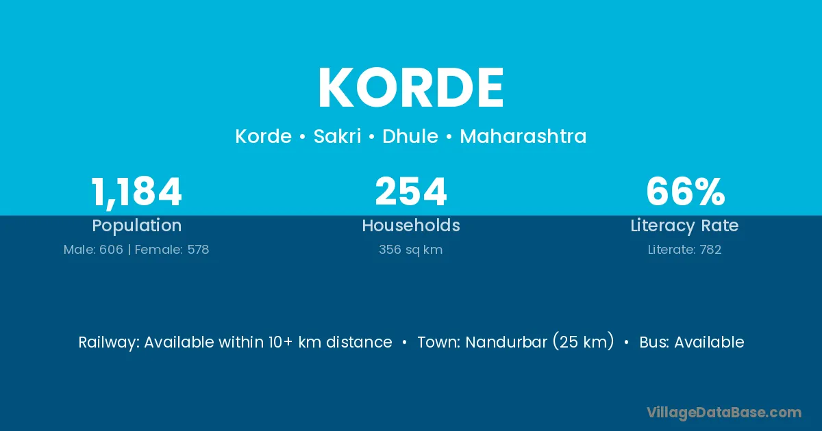 Nandurbar (25 km) is the nearest town to Korde village for major economic activities and is located approximately 25 km away.