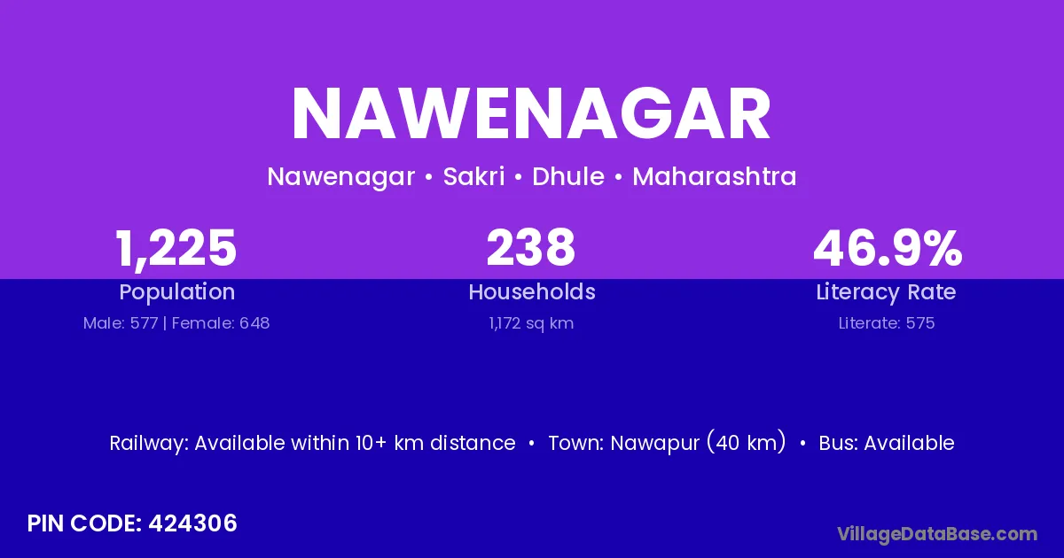 Nawapur (40 km) is the nearest town to Nawenagar village for major economic activities and is located approximately 40 km away.