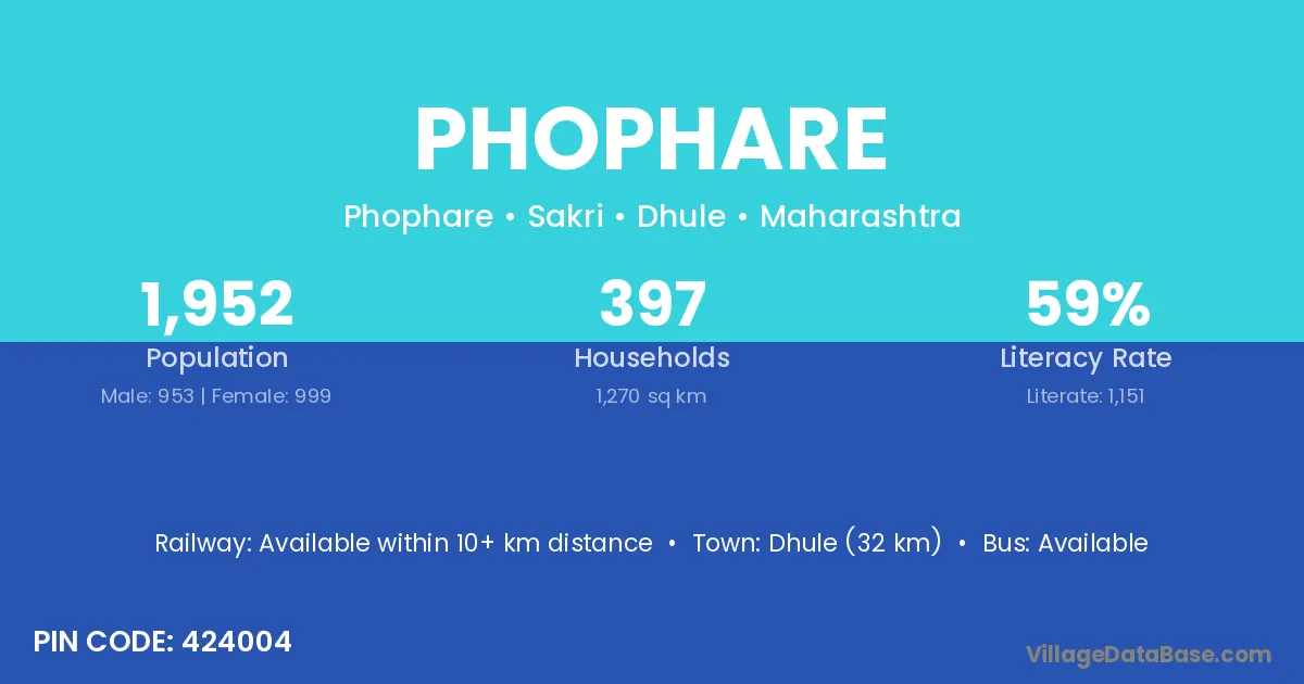 Dhule (32 km) is the nearest town to Phophare village for major economic activities and is located approximately 32 km away.
