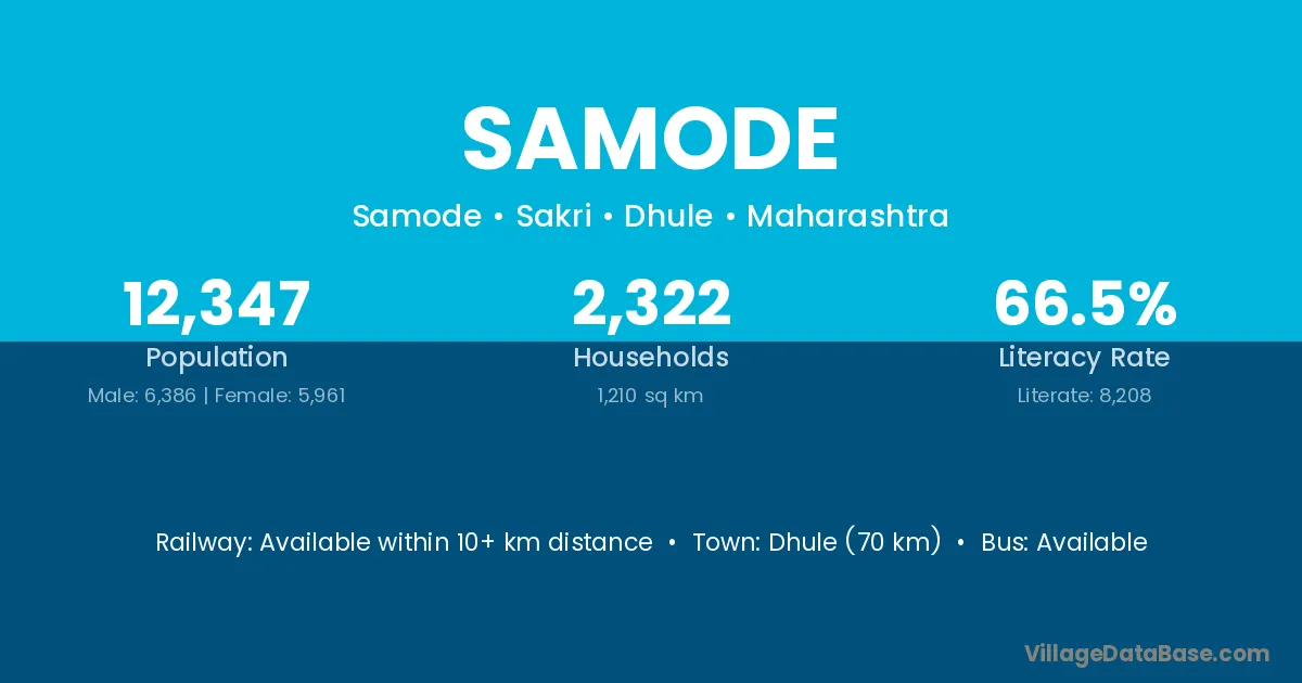 Dhule (70 km) is the nearest town to Samode village for major economic activities and is located approximately 70 km away.