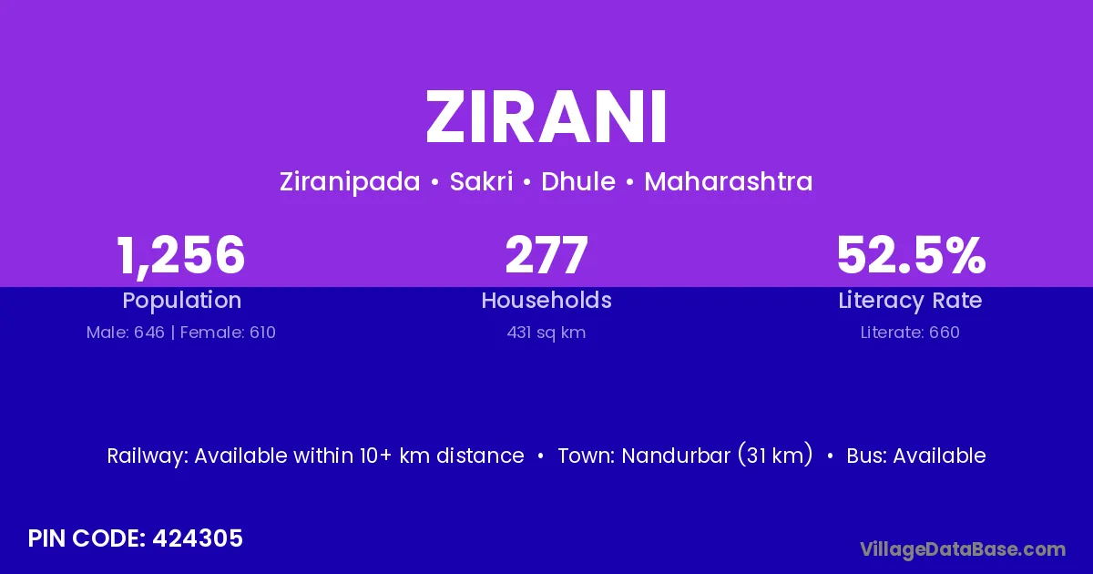 Nandurbar (31 km) is the nearest town to Zirani village for major economic activities and is located approximately 31 km away.