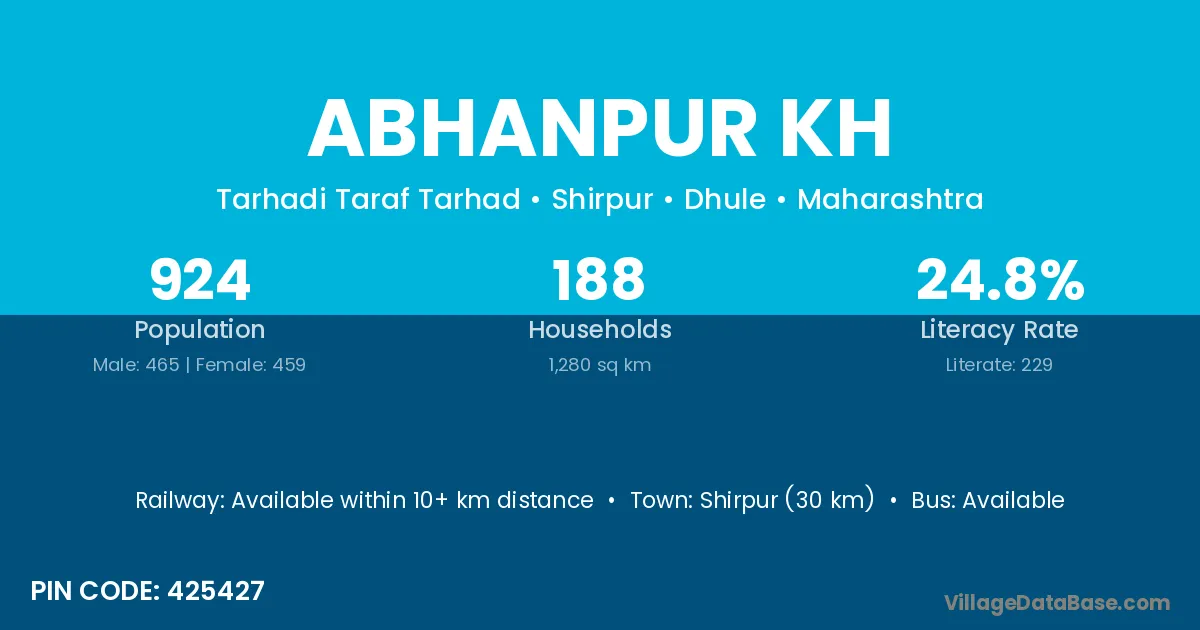 Shirpur (30 km) is the nearest town to Abhanpur Kh village for major economic activities and is located approximately 30 km away.