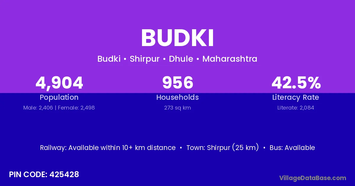 Shirpur (25 km) is the nearest town to Budki village for major economic activities and is located approximately 25 km away.