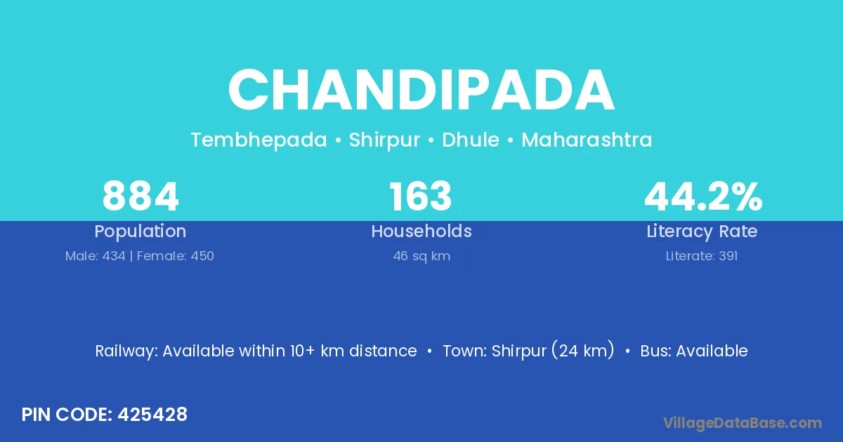 Shirpur (24 km) is the nearest town to Chandipada village for major economic activities and is located approximately 24 km away.