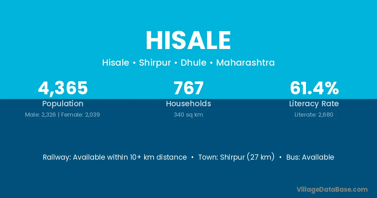 Shirpur (27 km) is the nearest town to Hisale village for major economic activities and is located approximately 27 km away.
