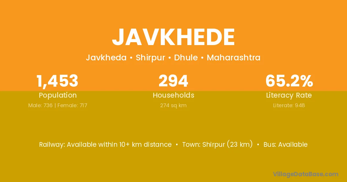 Javkhede village has a total population of 1,453 people, of which 736 are males and 717 are females.