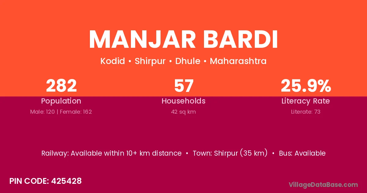 Shirpur (35 km) is the nearest town to Manjar Bardi village for major economic activities and is located approximately 35 km away.