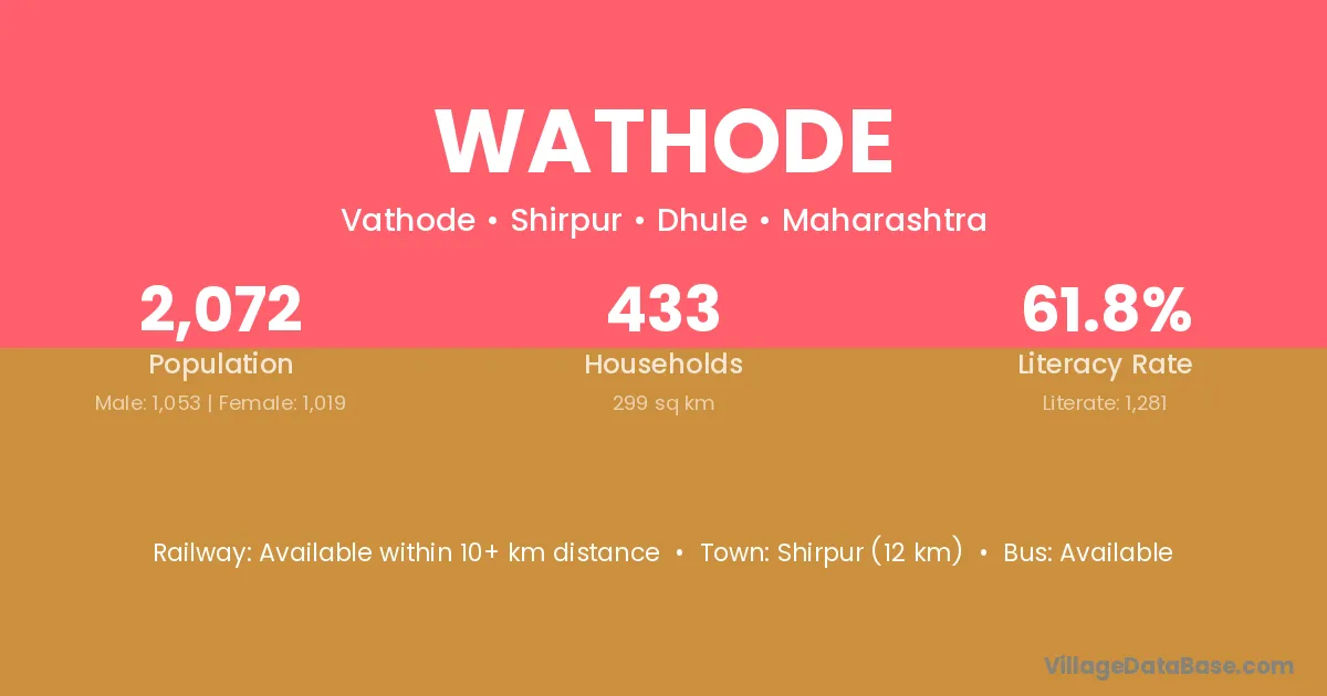 Shirpur (12 km) is the nearest town to Wathode village for major economic activities and is located approximately 12 km away.