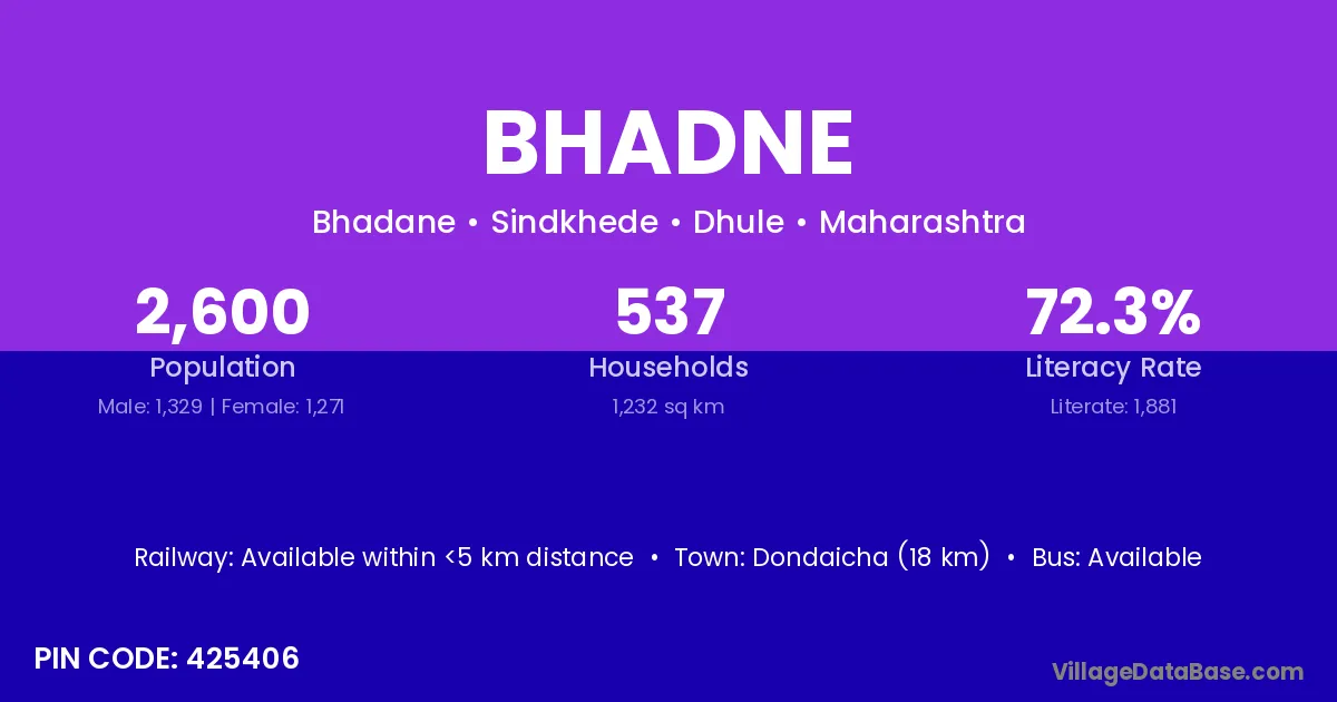Dondaicha (18 km) is the nearest town to Bhadne village for major economic activities and is located approximately 18 km away.