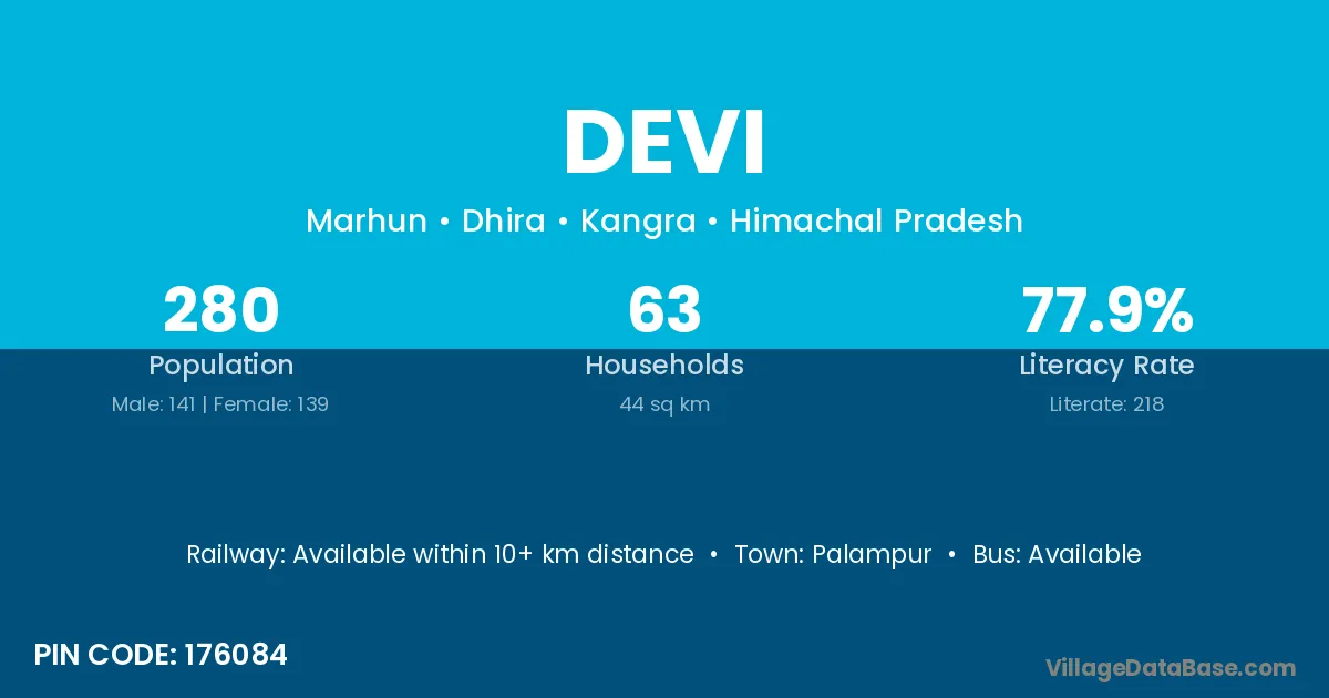 The literacy rate of Devi village is 62.37%. Male literacy stands at 71.73% and female literacy at 53.06%.