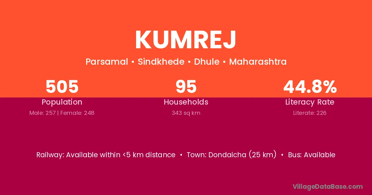 Dondaicha (25 km) is the nearest town to Kumrej village for major economic activities and is located approximately 25 km away.